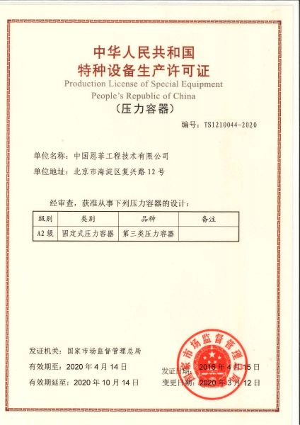 • 中華人民共和國(guó)特種設(shè)備生產(chǎn)許可證(壓力容器)